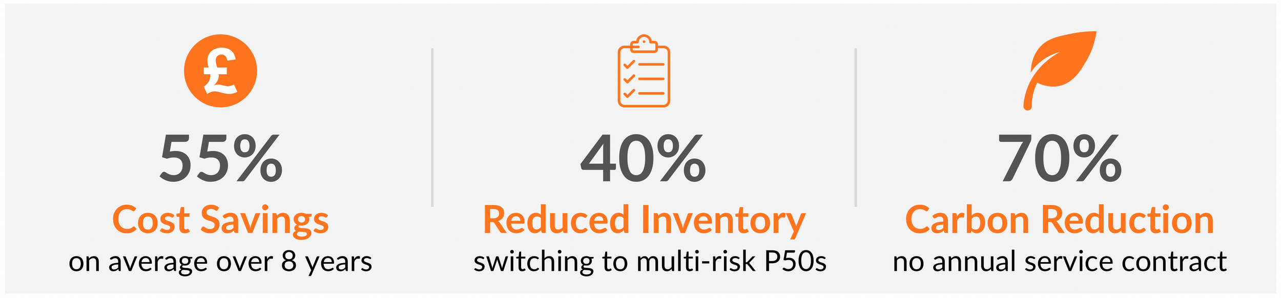 From substantial cost savings (on average 55% or more) to simplifying the decision making process in the event of a real fire situation, to reducing your company’s carbon footprint by 70% or more, you’ll gain a better understanding of why P50s offer far more than a fire extinguisher solution.